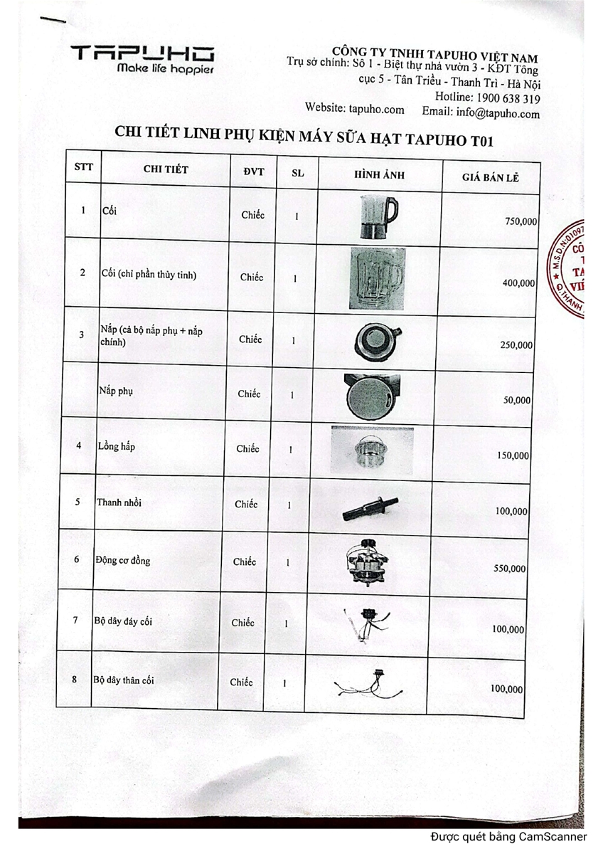 Dưới đây bảng giá Phụ kiện máy làm sữa hạt T01 TAPUHO công khai: