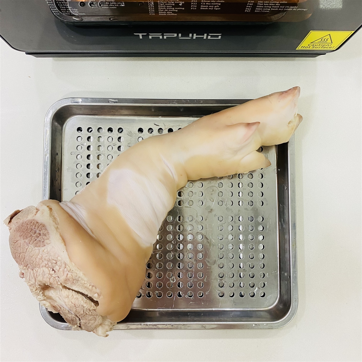 Tiếp theo, các bạn đem chân giò đi hấp. Bạn cho chân giò vào nồi chiên hơi nước Tapuho cài đặt chê độ hấp. Sau khi hấp xong khoảng 30 phút, bạn lấy chân giò ra và dùng tăm tre hoặc cây xiên inox chuyên dụng để đâm lên da chân giò.