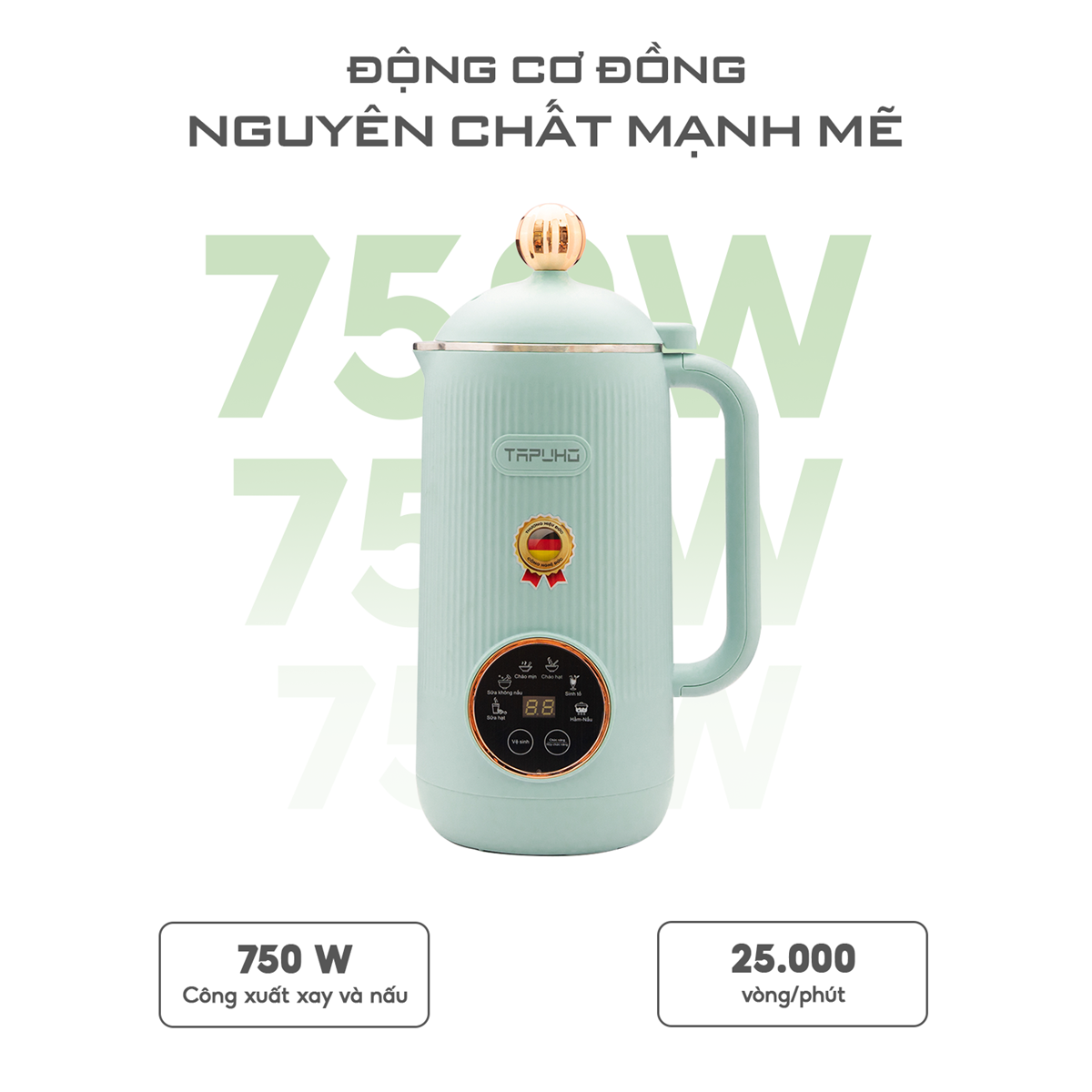 Sản phẩm có động cơ được làm bằng đồng nguyên chất cho công suất nấu lên đến 600w, công suất xay của máy là 150w. Tổng công suất lên đến 750w sẽ giúp máy hoạt động mạnh mẽ và bền bỉ hơn. Tốc độ của lưỡng dao lên đến 25.000 vòng/1 phút giúp xay nhuyễn mọi thực phẩm mà không cần lọc. Từ đó cho các bạn những cốc sữa hạt mịn ngon nhất trên thị trường hiện nay.