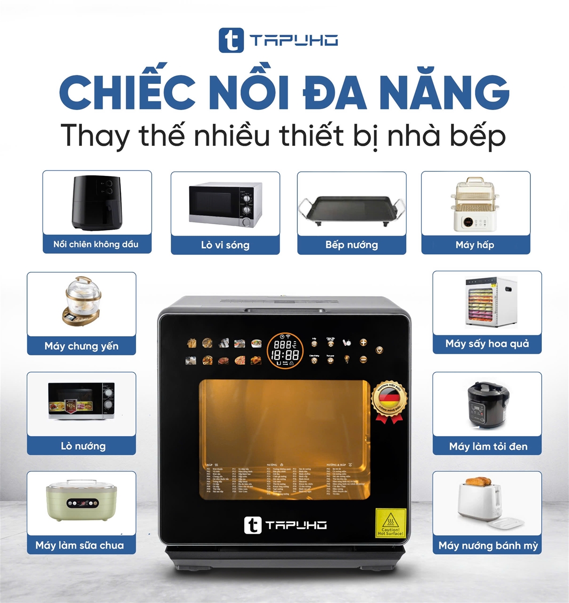 Nỗi lo không gian bếp chật hẹp không đủ không gian để chứa các thiết bị nhà bếp sẽ không còn nữa khi TAPUHO LUXURY STEAM FRYER TSF16 COLOR có thể sử dụng chức năng tương đương với hơn chục thiết bị nhà bếp khác nhau như : nồi chiên không dầu, nồi hấp, nồi áp suất, máy sấy hoa quả, máy ủ sữa chua, lò nướng, lò vi sóng, máy làm bỏng ngô, máy nướng bánh mỳ, nồi chưng yến, máy làm tỏi đen... và đặc biệt với tính năng đa dạng như vậy sẽ giúp chúng ta tiết kiệm được rất nhiều chi phí mua sắm, thời gian vệ sinh bảo dưỡng.