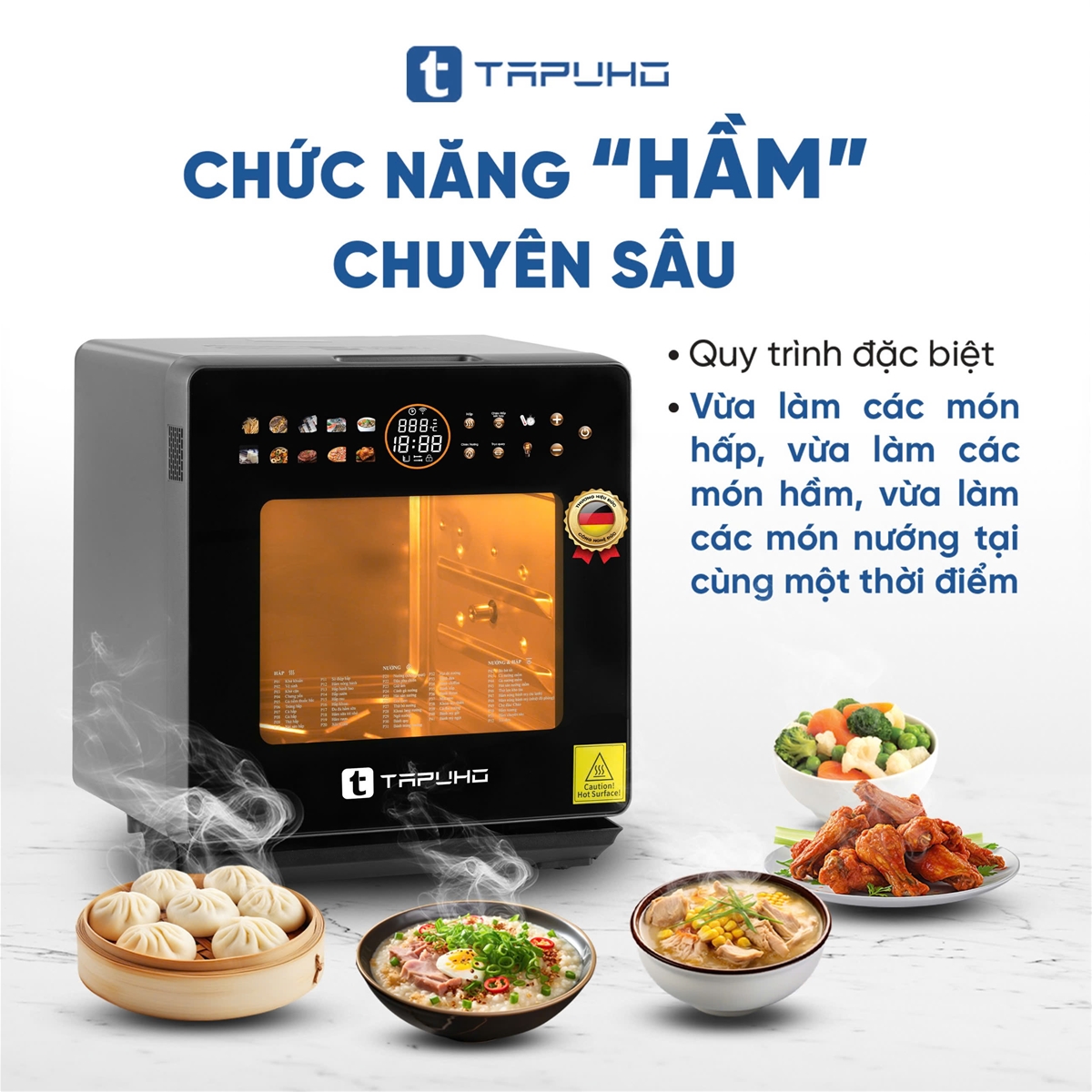 Thì ở TAPUHO TSF16 COLOR, TAPUHO lại cho ra chức năng “HẦM CHUYÊN SÂU” với cơ chế hoạt động độc đáo hơn, giúp người dùng có thể vừa làm các món hấp, vừa làm các món nướng, vừa làm các món hầm tại cùng một thời điểm!