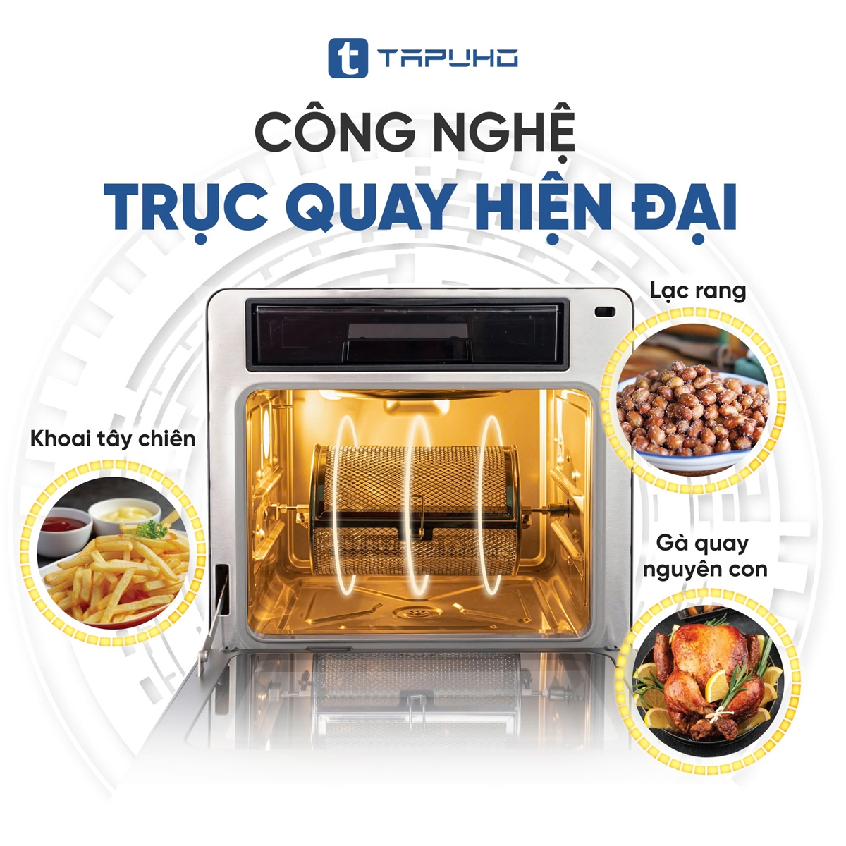 Với tính năng này, chúng ta có thể chiên/ nướng cả con gà nguyên con quay tự động, chiên khoai tây, rang các loại đậu hạt chín đều mà không cần bất kỳ thao tác lật trở nào, mang lại sự tiện dụng tối đa cho người tiêu dùng.