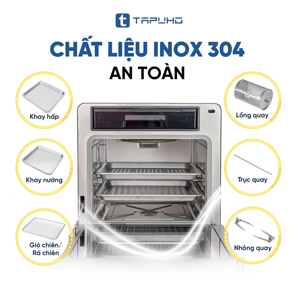 Toàn bộ phần khoang lò tiếp xúc trực tiếp với thực phẩm của TAPUHO LUXURY STEAM FRYER TSF16 COLOR đều được làm từ chất liệu inox304 cao cấp, an toàn, sáng đẹp theo thời gian và lại dễ dàng vệ sinh; không lo độc hại, bong tróc, han gỉ.