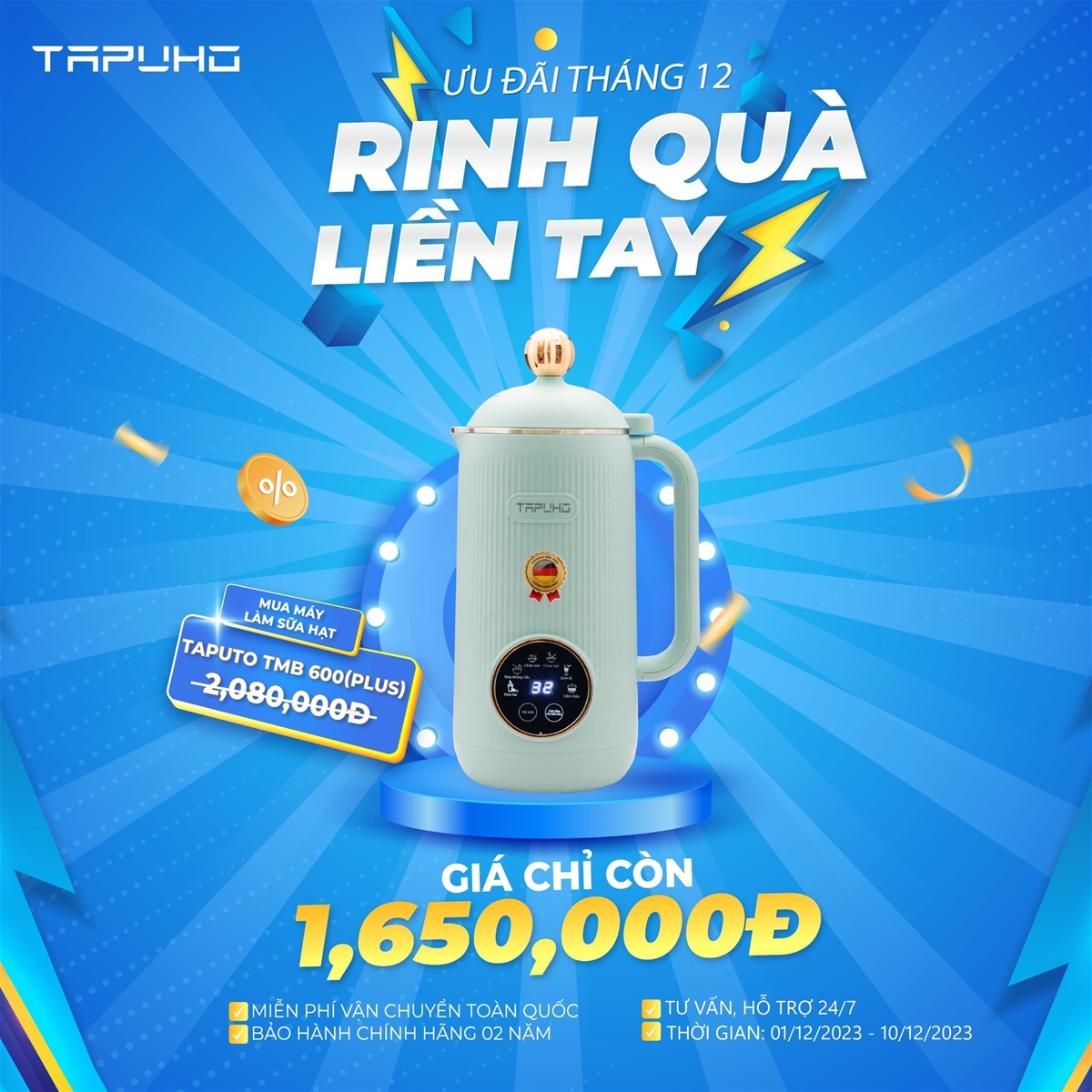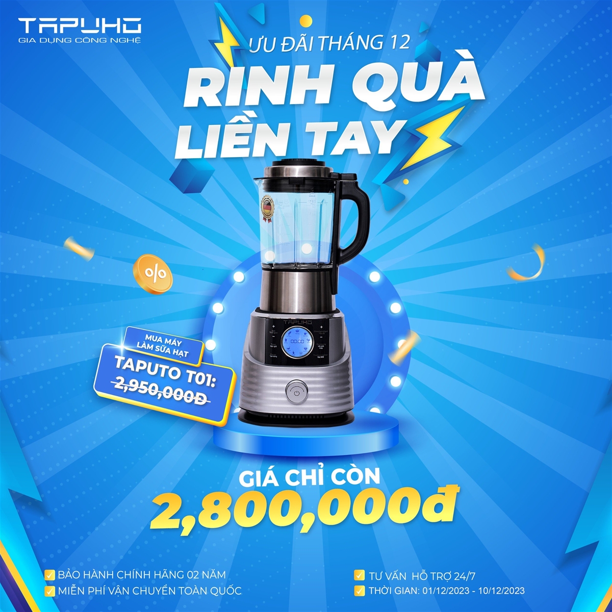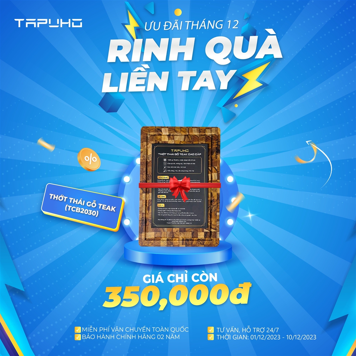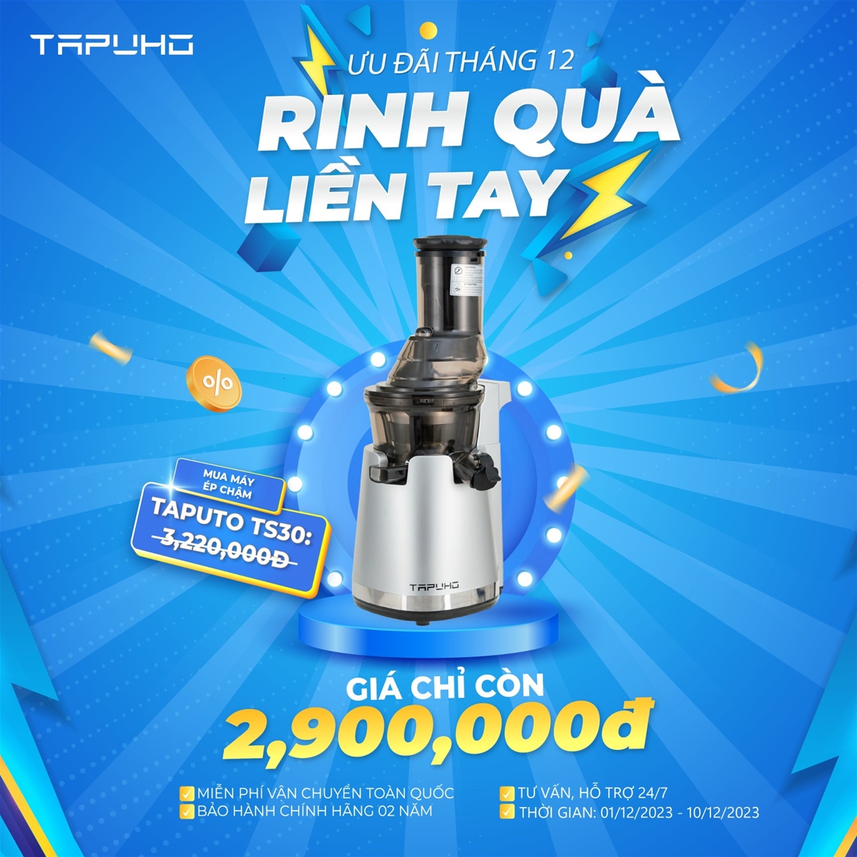 01/12/2023Cùng Tapuho chào tháng 12 với chương trình sale siêu to, giảm giá cực sốc từ 01/12/2023 – 10/12/2023. Chương trình được áp dụng trên toàn hệ thống đại lý Tapuho và tất cả các hình thức mua sắm online.