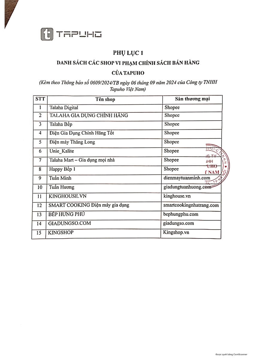 THÔNG BÁO: Chấm dứt bảo hành sản phẩm thương hiệu Tapuho đối với tất cả các shop vi phạm chính sách của TAPUHO